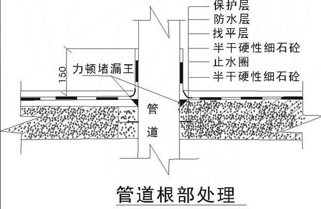 坐便器立管后,樓板四周用防水砂漿堵嚴(yán),縫大則用細(xì)石混凝土堵嚴(yán)抹平,立管接口處用力頓堵漏王封嚴(yán),上面做防水層至管頂部。坐便器尾部進(jìn)水處與管接口用力頓堵漏王封嚴(yán),外刷一遍抗?jié)B王后再二遍防水涂料。