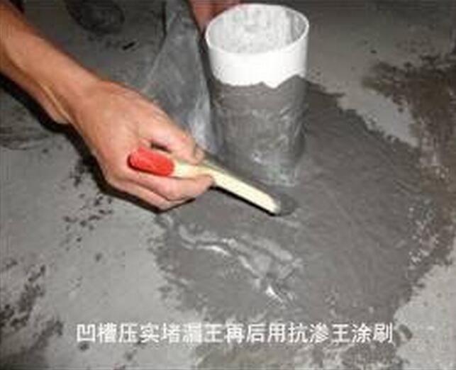 2、細(xì)部節(jié)點(diǎn)施工:用漆刷蘸取攪拌好的抗?jié)B王,在管根部、地漏、陰陽角等容易漏水的薄弱部位均勻涂刷。地面與墻角交接處,涂膜防水卷材上,刷兩次防水涂料。