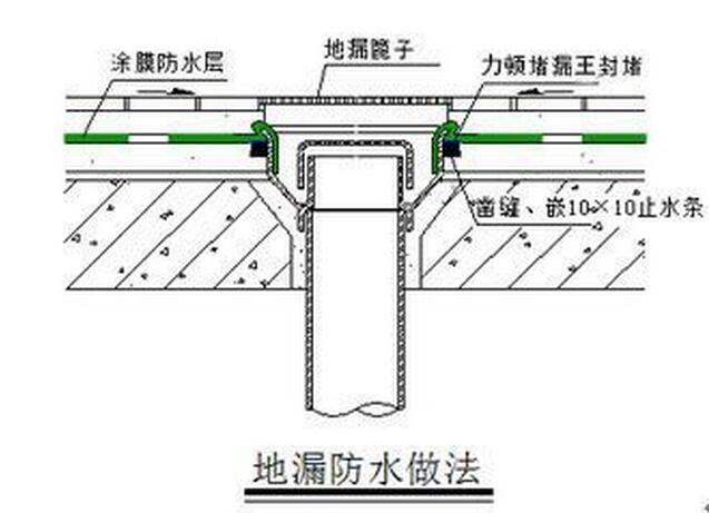 ③地漏上口四周10mm×15mm用力頓堵漏王灌漿密封,先刷一遍抗?jié)B王后再做防水涂料。由于混凝土凝固時有微量收縮,而地漏口大底小,外表面與混凝土接觸處容易產(chǎn)生裂縫。為了防止地漏周圍滲水,最好將地漏加以改進(jìn),在原地漏的基礎(chǔ)上加防水托盤,以提高衛(wèi)生間防水的質(zhì)量。