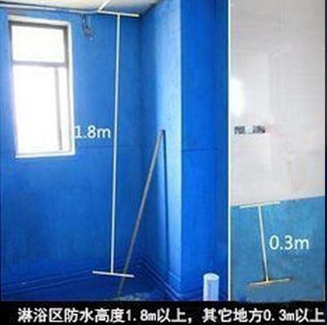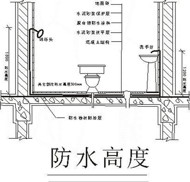 淋浴處防水做到1800mm高,洗手盆處做到1200mm,其它部位30mm高度。